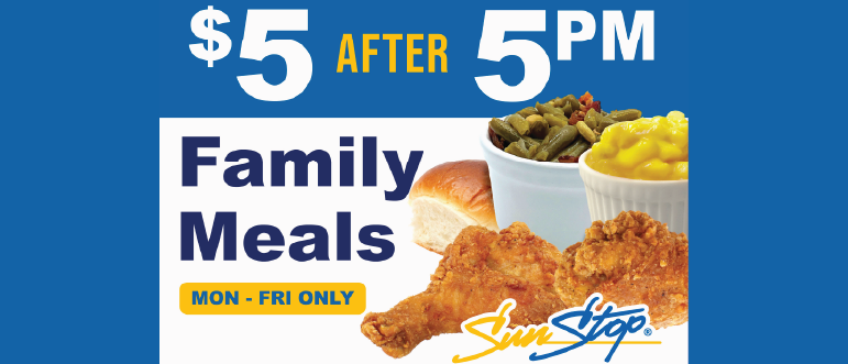 Georgia-based SunStop and Eat’s Delis are introducing the “Feed the Fam—$5 After 5” meal deal. The deal includes two chicken tenders or two chicken legs, served with two sides and a roll for $5 after 5 p.m., and is available Monday through Friday at participating locations.