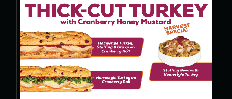 - Thick-Cut, Homestyle Turkey with Stuffing: “Served hot on a toasted cranberry multi-grain roll with all the trimmings; homestyle stuffing, thick-cut homestyle turkey, Vermont cheddar cheese, rich turkey gravy and cranberry honey mustard. This sub is a balance of savory and sweet. Available as a 6-inch or 12-inch sub.”