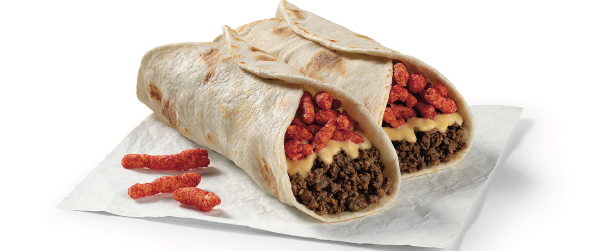 - Cheetos Flamin' Hot Burrito: “Packed with seasoned ground beef, creamy queso, a Monterey-Cheddar blend and Cheetos Flamin' Hot inside a freshly made tortilla, heat takes center stage in this burrito.”